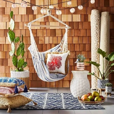 Freshen up your outdoor area in sleek style with the Cameo Outdoor Rug from Opalhouseā¢. In a classic rectangular shape, this gray and white area rug features a subtle block-print design in gray and white for classic appeal, while its neat, finished edge adds polished flair to your space. A perfect outdoor accessory to infuse some bold sophistication into your outdoor retreat, this printed area rug comes with a latex backing to help it stay in place and create secure footing.